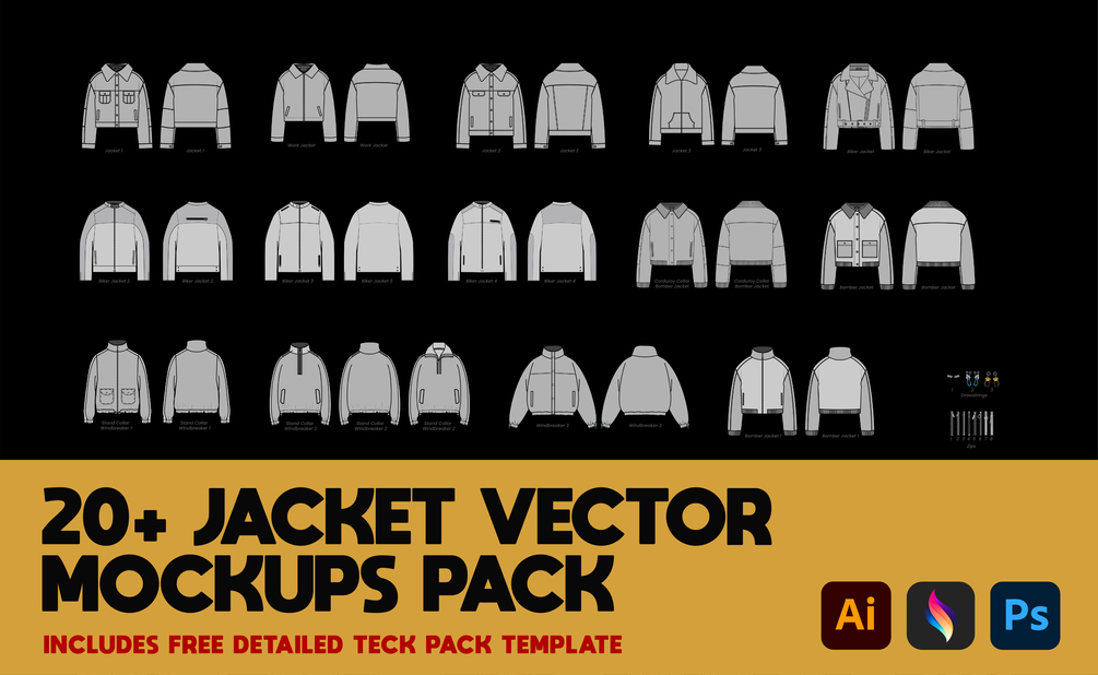 - ✅ Adobe Illustrator File: 20 fully editable vector jacket mockups (front & back)